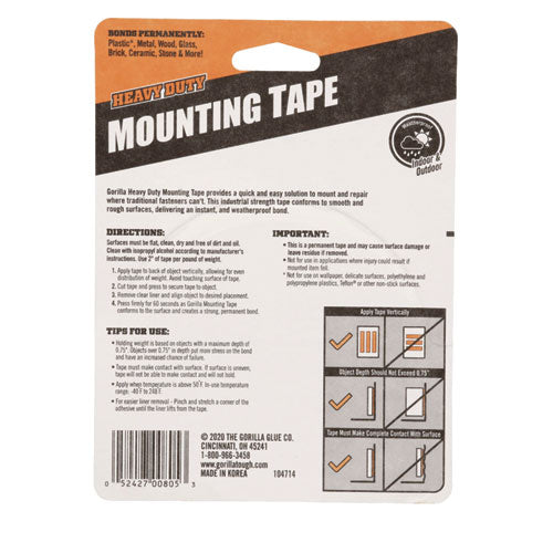 Gorilla Heavy Duty Mounting Tape is a double-sided tape that mounts in an instant, for a permanent, weatherproof bond. The industrial strength, double-sided tape delivers a heavy-duty bond. Perfect for indoor and outdoor projects and sticks to smooth and rough surfaces. Completing projects is easy with this tough, double-sided tape. Mount, build, and repair!