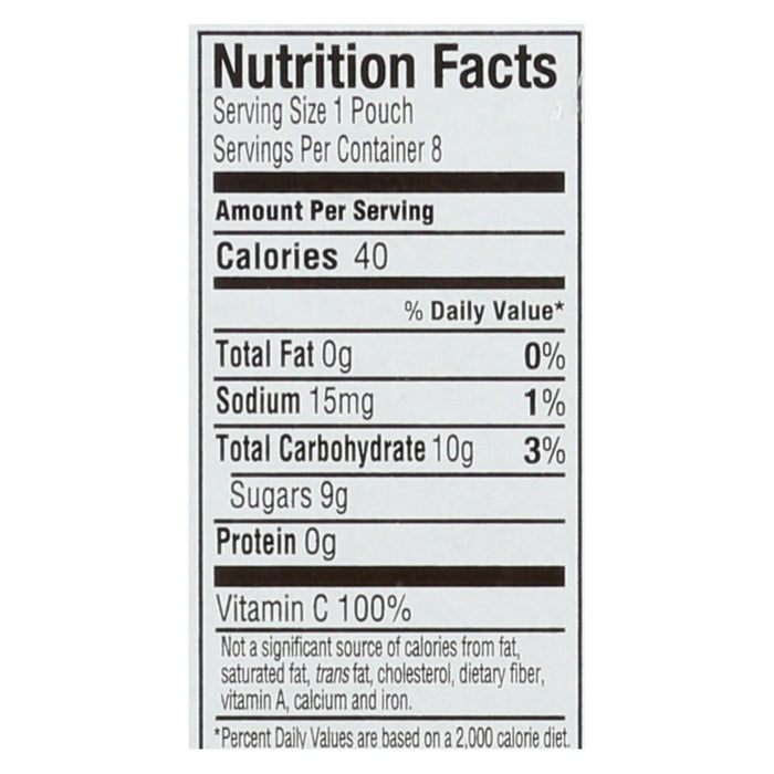Honest kids juice drinks super fruit punch is an organic juice drink from concentrate and sweetened only with fruit juice. This product is in non gmo project verified which means that if there is a bioengineered version of an ingredient, they don't use it. The product comes in a pouch which makes it fun for kids and is easy for them to drink. Each pouch contains approximately 20 g. Of sugar per 6.75 fl. Oz. Serving. Includes eight 6.75 fl. Oz. Pouches of punch.