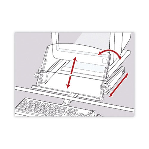 Keeps documents between monitor and keyboard to help reduce head, neck and eye movement. Transparent back plate supports wide and heavy documents. Skid-free base. Angle and height adjustable. Can stand alone on desktop or hang over edge. Elastic line-guide enables easy data entry and helps keep documents in place.