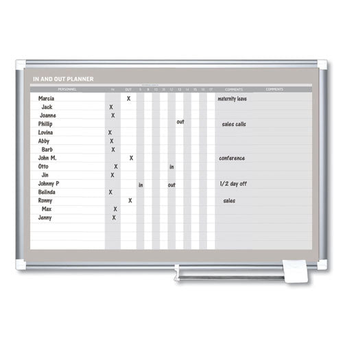 In & Out board features rows for employees or visitors and is perfect for displaying staff schedules. Magnetic Gold Ultra™ lacquered steel dry erase surface is recommended for frequent use. Sliding aluminum pen tray keeps markers and magnetic accessories where you want them. Aluminum frame features the four-corner system for easy mounting.