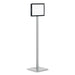 The Info Stand BASIC Tabloid-Size Floor Stand from DURABLE® is the go-to solution for effortless professional signage display. Easily showcase important information, instantly grabbing attention and effectively conveying your message right where you need it. Its sleek and professional appearance is perfect for directions, menu displays at host stands, guest information in lobbies and hotel entrances, valet and parking signage, safety alerts, restroom signage, and promotions. The double-sided visibility displays two messages simultaneously for maximum impact. Perfect for store entrances, conference centers, or any area where signage needs to be seen from both sides. Keep your messaging up to date with the innovative flip-up magnetic DURAFRAME frames. This unique design means you can update promotions, announcements, safety information, or directional signage without any hassle. Simply lift the frame, swap out your content, and secure it back in place with the magnetic closure. This keeps your signage fresh, relevant, and engaging for your employees and customers. The frame rotates 360° so you can display signage in either portrait or landscape orientation to best suit your display needs, offering flexibility and versatility for various signage applications. Constructed from aluminum, and a weighted base with non-slip pads, the stand offers maximum stability, preventing any potential tipping.