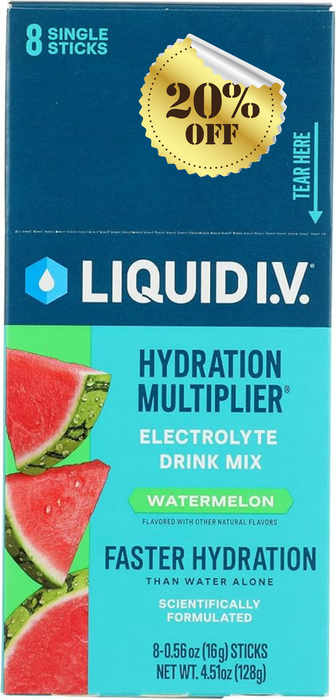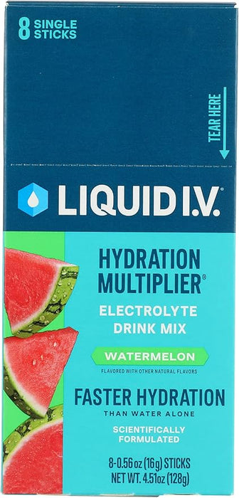 Experience premium hydration with Liquid IV Drink Mix Watermelon Single - Case of 8 - 0.56 Oz. This refreshing electrolyte powder delivers hydration 2-3 times faster than water alone using breakthrough Cellular Transport Technology.