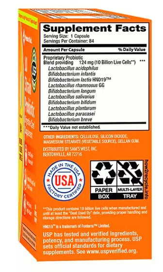 Member's Mark™ 10 Strain Probiotic contains 10 billion active cultures** per capsule and 10 strains of beneficial bacteria: Lactobacillus acidophilus, Bifidobacterium lactis HN019, Lactobacillus rhamnsosus GG, Bifidobacterium infantis, Bifidobacterium longum, Lactobacillus salivarius, Bifidobacterium bifidum, Lactobacillus plantarum, Lactobacillus paracasei and Bifidobacterium breve. This probiotic blend can help replenish healthy bacteria and support digestive and immune health.*