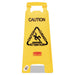 The Rubbermaid Commercial 2-Sided Caution Safety Sign is lightweight and versatile. The caution sign features the universal wet floor symbol and the word "caution" imprinted in English, French and Spanish for effective communication to broad audiences. The 25-inch model is suitable for use in a variety of locations, including narrow areas. The folding design allows for convenient storage or transport on a janitor cart. Each of the safety signs features durable plastic construction that will not rust, corrode, or fade. The 2-sided, bright yellow design meets OSHA requirements. ANSI compliant multi-lingual graphics warn of a nearby hazardous area. The flexible locking-style hanger makes the sign stationary and easily visible from all directions. Measures 12" deep when open.