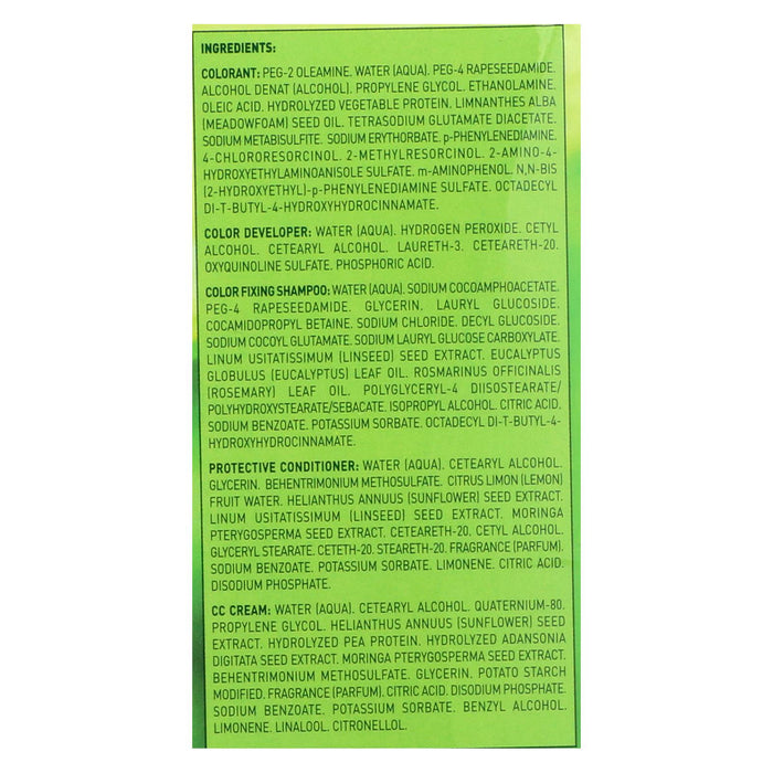 ingredients : cc cream: water;aqua;cetearyl alcohol;quaternium-80;propylene glycol. Helianthus annuus;sunflower;seed extract. Hydrolyzed pea protein. Hydrolyzed adansonia digitata seed extract. Moringa pterygosperma seed extract. Behentrimonium methosulfate. Glycerin. Potato starch modified. Fragrance;parfum;citric acid. Disodium phosphate. Sodium benzoate. Potassium sorbate. Benzyl alcohol. Limonene. Linalool. Citronellol;color developer: water;hydrogen peroxide. Cetyl alcohol. Cetearyl alcohol. Laureth-3. C