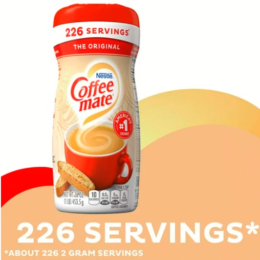 Nestle Coffee mate Original Powdered Coffee Creamer is an ideal way to create a delicious cup of coffee perfection. Smooth and rich, this original creamer delivers classic flavor that transforms every drinking experience. Original Coffee mate creamer is lactose free, gluten free and non dairy. Coffee creamer powder makes it easy to add the right amount of flavor every time, letting you easily transform your coffee into warm deliciousness. Whether it's your morning cup or an afternoon pick-me-up, this flavored coffee creamer wakes up your coffee. Store Coffee mate powdered creamer in a cool, dry place.