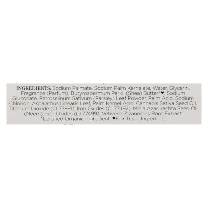 ingredients : sodium palmate;sodium palm kernelate;water;glycerin;fragrance;parfum;butyrospermum parkii;shea;butter*•;sodium gluconate;petroselinum sativum;parsley;leaf powder;palm acid;sodium chloride;aspalathus linearis leaf;palm kernel acid;cannabis sativa seed oil;titanium dioxide;ci 77891;iron oxides;ci 77492;melia azadirachta seed oil;neem;ci 77499;vetiveria zizanoides root extract