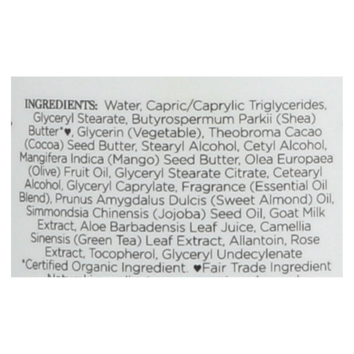 ingredients : water;capric/caprylic triglycerides;glyceryl stearate;butyrospermum parkii;shea;butter*♥;glycerin;vegetable;theobroma cacao;cocoa;seed butter;stearyl alcohol;cetyl alcohol;mangifera indica;mango;olea europaea;olive;fruit oil;glyceryl stearate citrate;cetearyl alcohol;glyceryl caprylate;fragrance;essential oil blend;prunus amygdalus dulcis;sweet almond;oil;simmondsia chinensis;jojoba;seed oil;goat milk extract;aloe barbadensis leaf juice;camellia sinensis;green tea;leaf extract;allantoin;rose ext