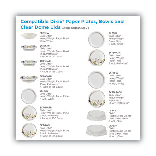 Moisture resistance, grease resistance and dry and wet rigidity make Dixie Ultra® Heavy-Weight Paper Bowls the right choice for the heaviest, messiest foods you serve. The unique structure and multi-layer coatings give these disposable paper bowls their strength, while the Soak-Proof Shield helps keep moisture and grease from leaking through. The Pathways® design matches other Dixie Ultra® plates, platters, bowls and cups to create an attractive, coordinated look. These heavy-duty paper bowls are ideal for foodservice and special events, and because they're microwaveable and cut-resistant, these small paper bowls come in handy in kitchens and breakrooms.