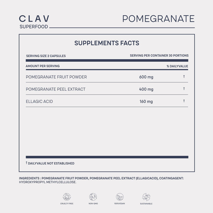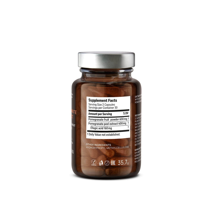 Premium Pomegranate Supplement - Formulated to capture the full spectrum of pomegranate goodness, each pomegranate capsule offers a potent 160mg of Ellagic Acid. Feel the difference with a truly comprehensive pomegranate supplement. Rich in Antioxidants & Polyphenols - Our pomegranate capsules are a source of natural benefits, boasting 40% ellagic acid. Experience the synergy of key antioxidants and polyphenols from meticulously sourced pomegranate extract. 1000mg Pomegranate Power - Dive into nature's bounty with our pomegranate extract capsules, carefully crafted with 600mg fruit powder & 400mg peel extract in each daily dose. Experience genuine benefits drawn from the pure essence of real pomegranate. Supports Heart & Joints: Known for heart health and joint support, make pomegranate an essential part of your daily regimen. Sustainably Made in Germany - Crafted with love for nature, and abiding by HACCP, GMP, and ISO 9001 standards. Enjoy vegan-certified, gluten-free, and lactose-free goodness in a fully recyclable amber glass bottle.