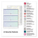 Incorporates security features recommended by the National Check Fraud Center. Compatible with most money management software programs. Security features include: Check-21 compliancy, "VOID" pantograph on the front and back, erasure-resistant background, security warning, anti-splice backer, security features listing, watermark, check verification number, patterned background and microtext print.