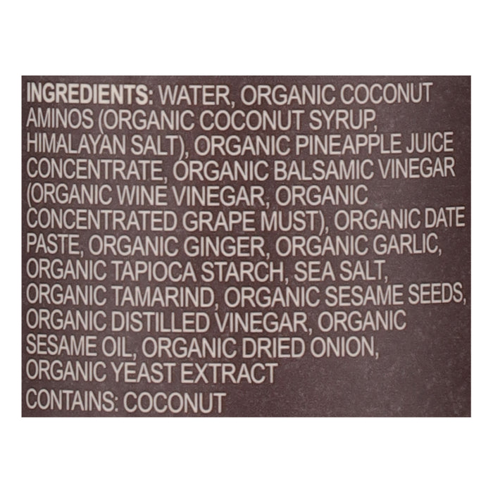 ingredients : water;organic coconut aminos (organic coconut syrup, water, himalayan salt);organic pineapple juice concentrate;organic mango puree;organic date paste;organic white balsamic vinegar (organic white wine vinegar, organic grape must);organic balsamic vinegar (organic wine vinegar, organic concentrated grape must);organic garlic;organic tapioca starch;organic ginger;sea salt;organic tamarind;organic sesame seeds;organic distilled vinegar;organic sesame oil;organic onion powder;organic yeast extract