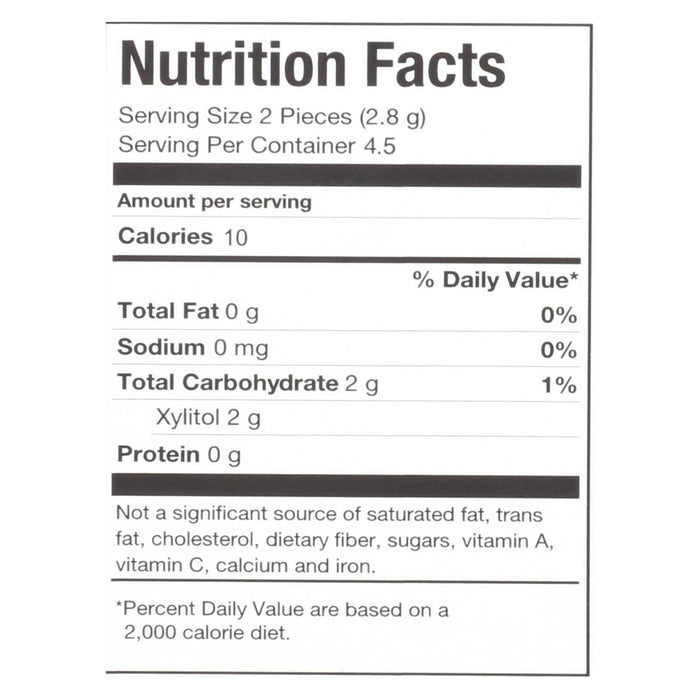 ingredients : xylitol;gum base;gum arabic;natural flavors;glycerol;carnauba wax;tocopherols