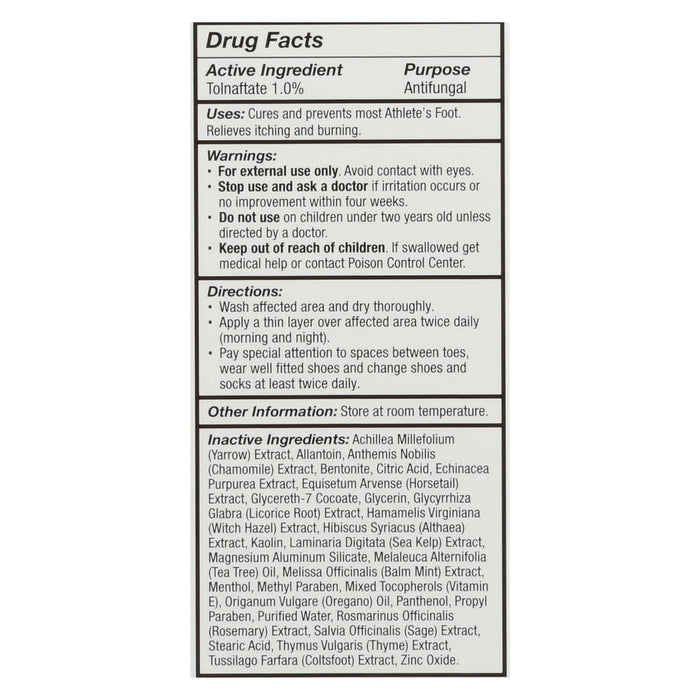 ingredients : active ingredient tolnaftate 1.0% purpose antifungal inactive : achillea millefolium;yarrow;extract;allantoin;anthemis nobilis;chamomile;bentonite;citric acid;echinacea purpurea extract;equisetum arvense;horsetail;glycereth-7 cocoate;glycerin;glycyrrhiza glabra;licorice root;hamamelis virginiana;witch hazel;hibiscus syriacus;althaea;kaolin;laminaria digitata;sea kelp;magnesium aluminum silicate;melaleuca alternifolia;tea tree;oil;melissa officinalis;balm mint;menthol;methyl paraben;mixed tocophe