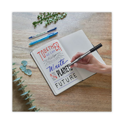 The BIC ReVolution Clic Stic ballpoint pen is made of recycled plastic and the packaging is made entirely of recycled materials. It has a multipurpose ballpoint tip and long-lasting ink delivers hours of writing. The slender, round semi-clear barrel is not only comfortable to (be)hold, but it's also got a handy window for checking your ink level. Use the convenient clip to hook it onto your pocket or notebook and take it everywhere you go. And since it's retractable, there's no cap to lose!
