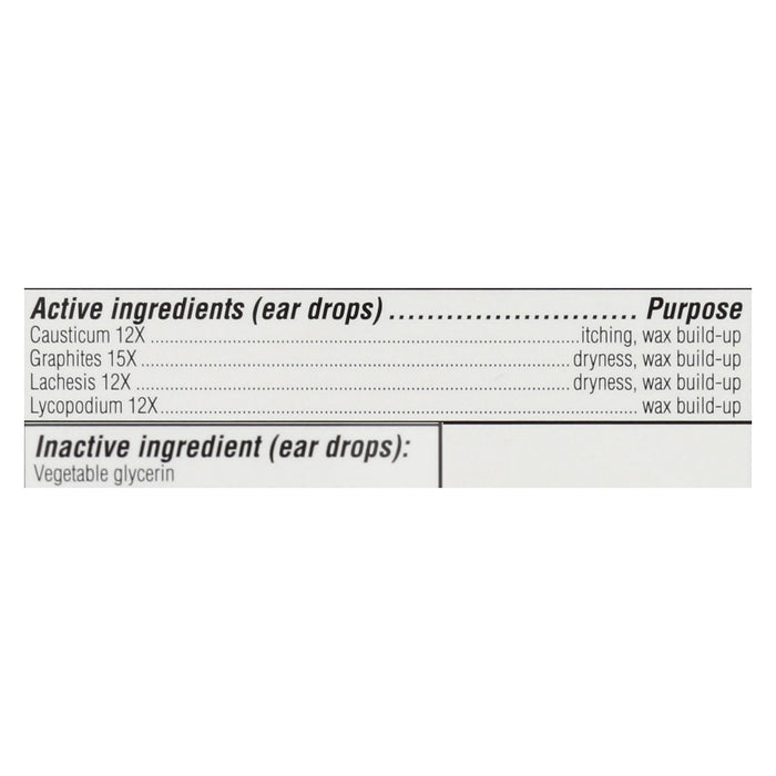 ingredients : active;ear drops;purpose causticum 12x itching;wax build-up graphites 15x dryness;wax build-up lachesis 12x purpose dryness;wax build-up lycopodium 12x purpose wax build-up inactive ingredient;: vegetable glycerin