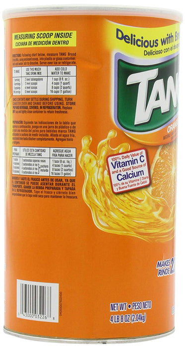 Tang Naturally Flavored Orange Powdered Drink Mix is a great way to jump-start your day. Made with a refreshingly sweet orange taste, Tang has 100% of your daily value of vitamin C and is a good source of calcium. Our orange powdered drink mix comes with a resealable canister to help lock in flavor for lasting enjoyment and simple preparation. There is enough for the whole family to enjoy. To prepare, simply pour the powdered orange drink mix into a pitcher, add water, stir, and enjoy. Start your day off right with the refreshing taste of Tang!