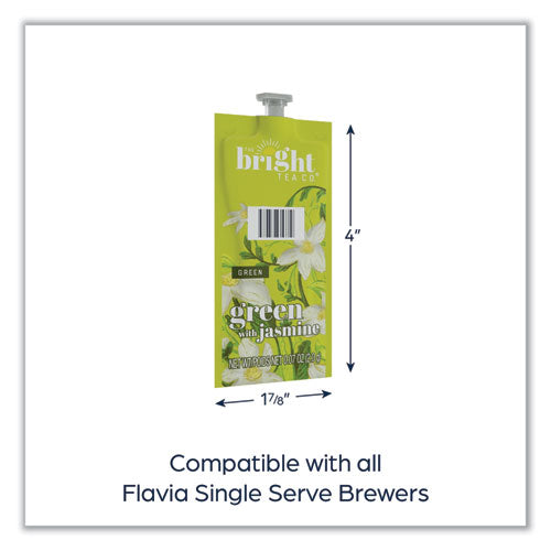 The Bright Tea Co.® Green with Jasmine Tea Freshpack features a light-bodied flavor with a refreshing taste and fragrant aroma of jasmine. Our brewing process, where nothing touches the ingredients other than hot water, ensures your drink does not taste like previous brews. Compatible with FLAVIA® single-serve brewers. For single-serve sustainability, innovative pouches are 100 percent recyclable through Terracycle.