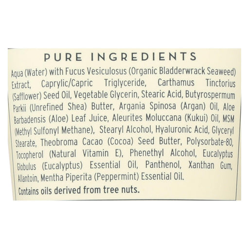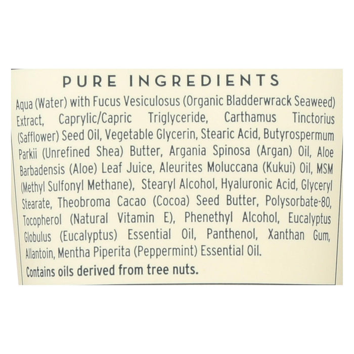 ingredients : aqua;water;with fucus vesiculosus;bladderwrack seaweed;and chlorella vulgaris extracts;caprylic/capric triglyceride;carthamus tinctorius;safflower;seed oil;glycerin;stearic acid;glyceryl stearate;stearyl alcohol;polysorbate 80;butyrospermum parkii;shea butter;theobroma cacao;cocoa;seed butter;sodium hyaluronate;aleurites moluccana;kukui;tocopherol;vitamin e;argania spinosa;argan;kernel oil;eucalyptus globulus;eucalyptus;oil;peppermint terpenes;triethyl citrate;mentha piperita;peppermint;aloe bar