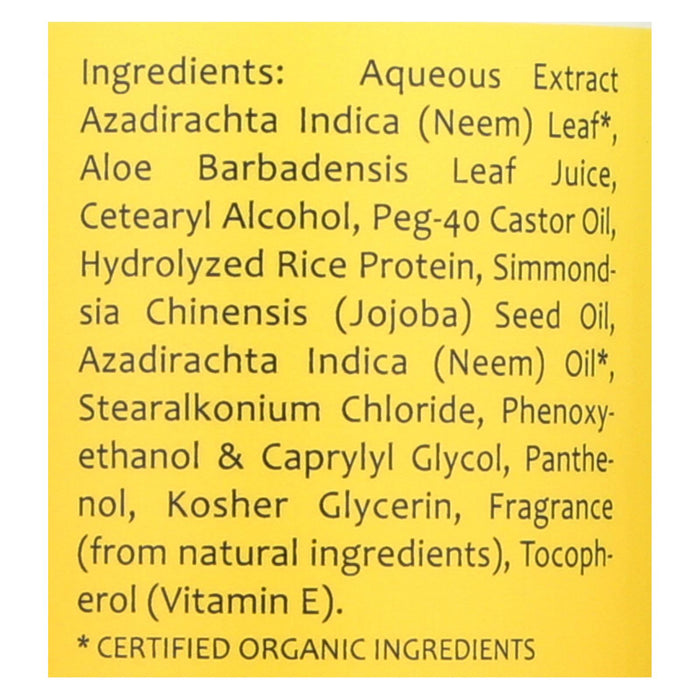 ingredients : aqueous extract azadirachta indica;neem;leaf;aloe barbadensis leaf juice;cetearyl alcohol;peg-40 castor oil;hydrolyzed rice protein;simmondsia chinensis;jojoba;seed oil;azadirachta indica;oil;stearalkonium chloride;phenoxyethanol & caprylyl glycol;panthenol;kosher glycerin;frangrance;from natural;tocopherol;vitamine