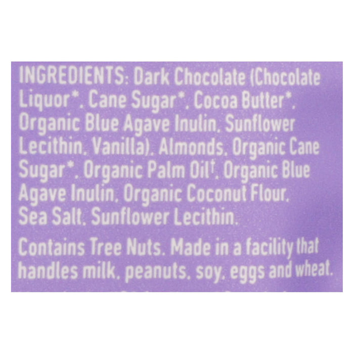 ingredients : dark chocolate (chocolate liquor , cane sugar , cocoa butter , organic blue agave inulin, sunflower lecithin, vanilla);almonds;organic cane sugar ;organic palm oil;organic blue agave inulin;organic coconut flour;sea salt;sunflower lecithin